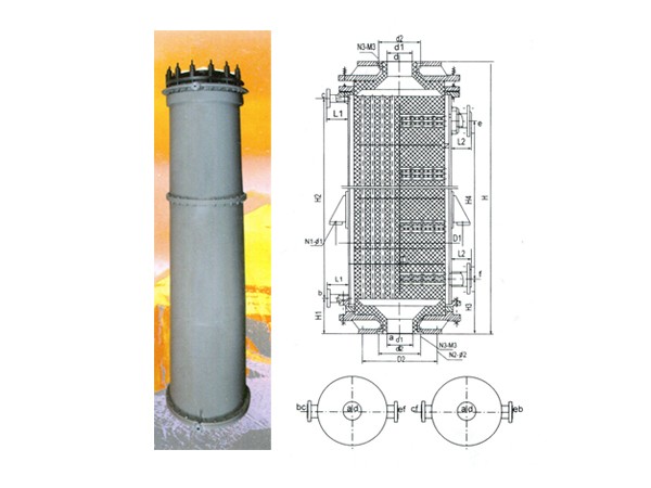 GX型系列列管式石墨降膜吸收器之吸收換熱元件為不透性石墨管,成膜條件極佳,故吸收效率高(與尾氣搭配合吸收率可達99%)生產強度大 CQ22/932X3000單管日產量可達0.8-1.2t33%鹽酸/天),且調節范圍大,產品不受污染,純度好,主要用于吸收Hcl氣制鹽酸。也可處理含Hcl、S02、NH2, HF、P2O5,H2S等氣體之尾氣,既回收某些成分 ,制取副產品減少或消除環境污染。本設 備之氣